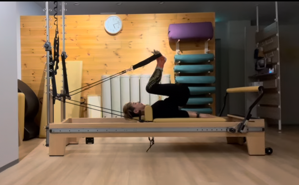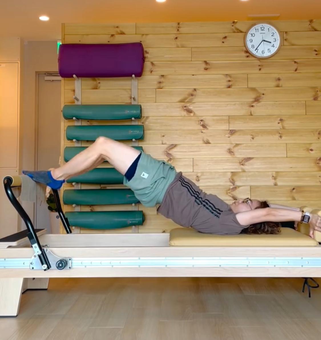 ピラティスマシンのリフォーマーで言えば、仰向けに寝て股関節の曲げ伸ばしをするフットワークというエクササイズです。