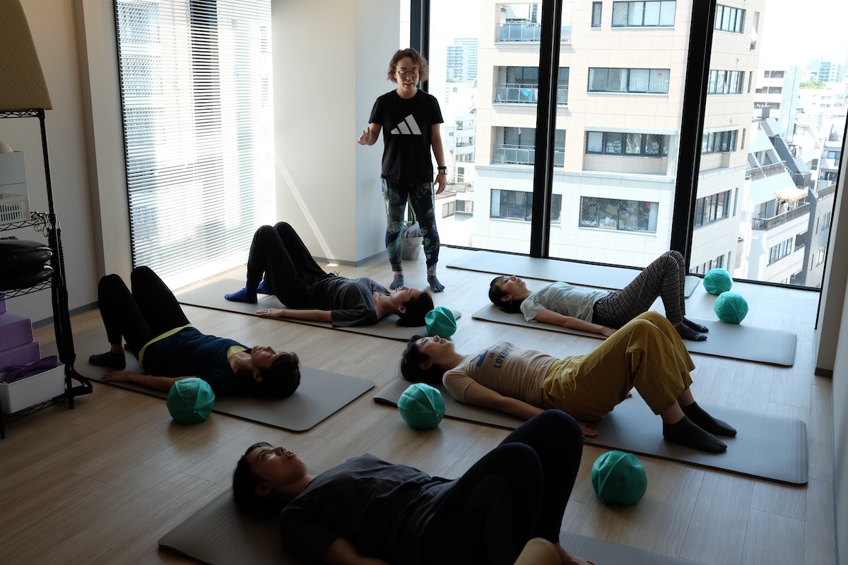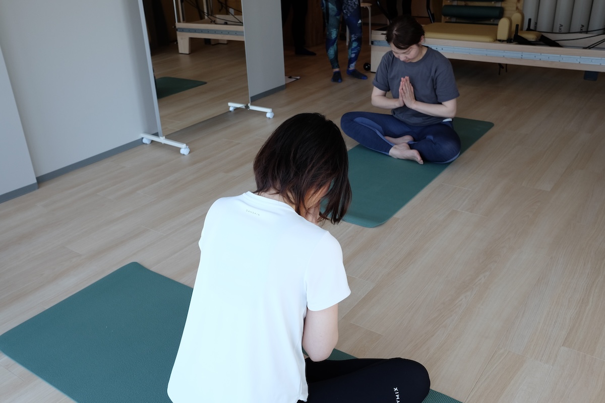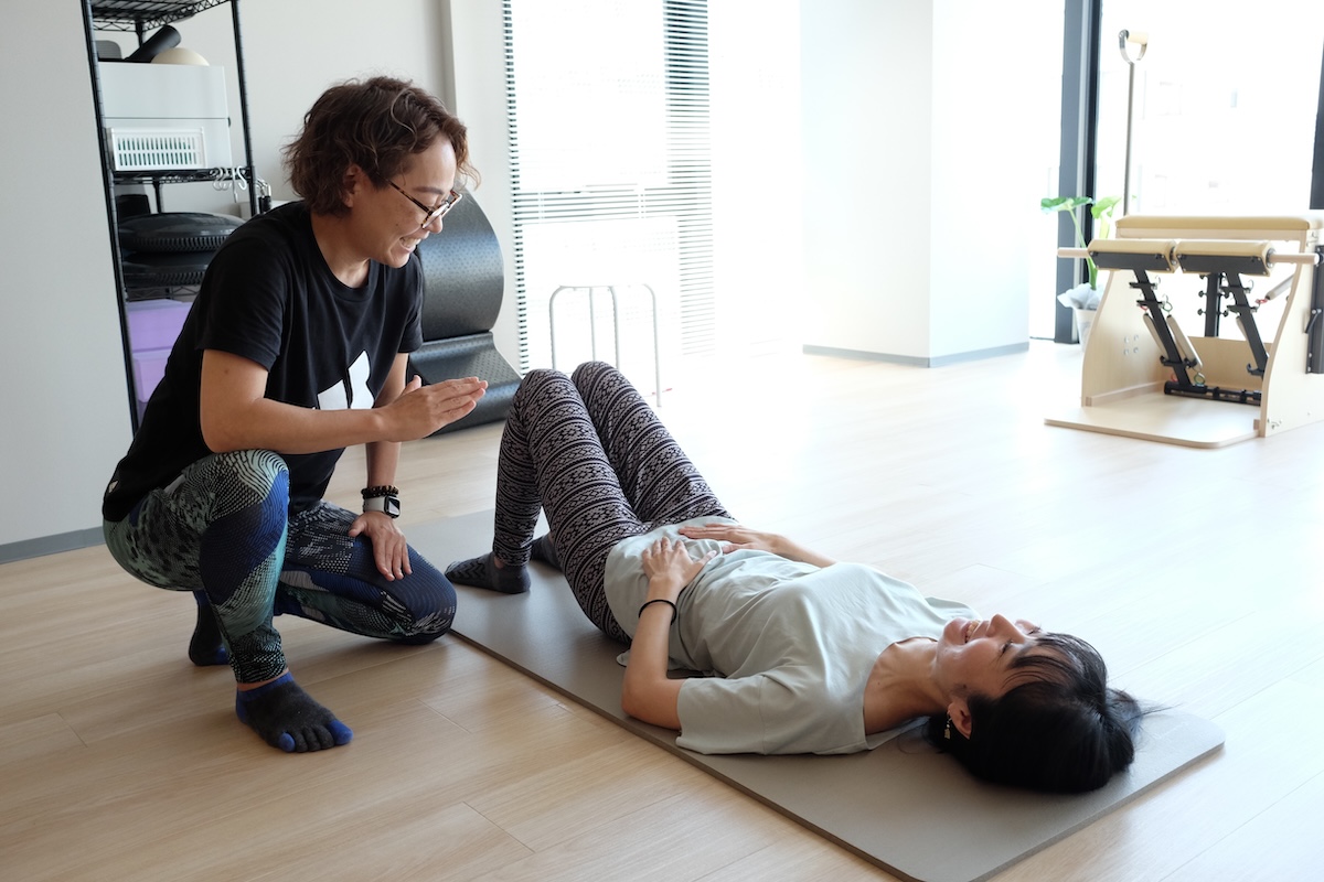 「ピラティス初体験の方は、今日は動かす身体の部分を意識できればOKです」と話し、モニターさんの緊張をほぐします。