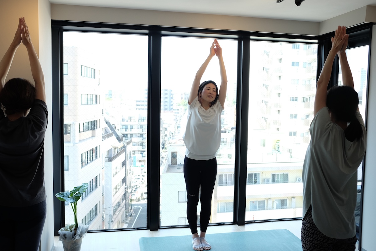 「リラックスして、自分の内側を感じながらやっていきましょう」ときょうこ先生。ヨガ初体験のモニターさんも伸びやかな声に引っ張られて、身体をしなやかに伸ばしています。